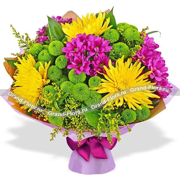 Делюкс: хризантема одноголовая (желтая) - 7 шт., хризантема зеленая кустовая - 7 шт., хризантема фиолетовая кустовая - 7 шт., солидаго - 6 шт., фетр фиолетовый, крафт, лента. Примерный диаметр букета 50х50 см.